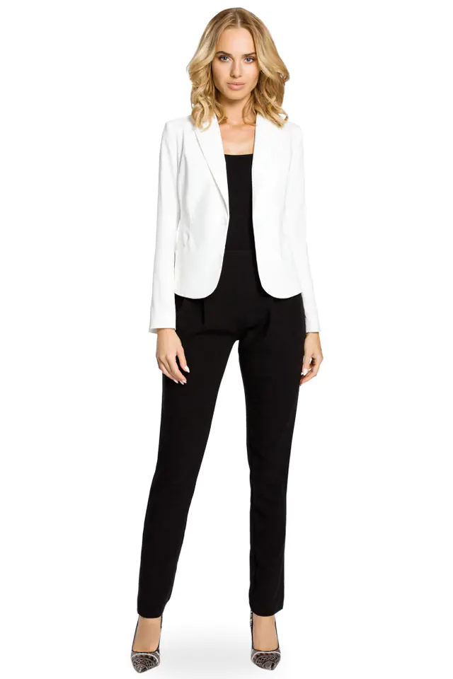 Elegancki i klasyczny damski żakiet z długimi, prostymi rękawami. Zapinany na jeden guzik. Podłużne przeszycia wzdłuż klap. Tył gładki z podłużnymi przeszyciami. Żakiet w całości na podszewce.