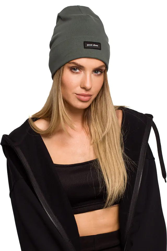 Bawełniana czapka typu beanie, z wywinięciem i naszywką z hasłem „good vibes” to nie tylko nakrycie głowy, ale modny dodatek do różnych stylizacji dla niej i dla niego.