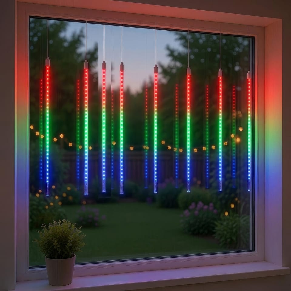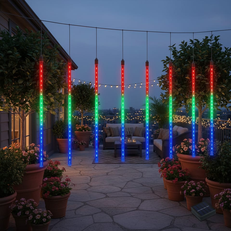Maclean Solar LED Lights, 2.4m Long, 144 LEDs, 8 RGB Icicles, Falling Icicles Mode, Li 800mAh Battery, MCE412