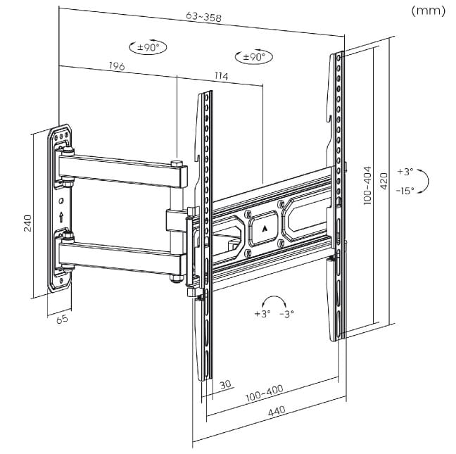 VESA compatibility: The screen size indicated is a suggestion only. A larger TV can be mounted on the mount if it does not exceed the maximum weight and falls within the specified VESA standard. We can easily attach a screen in VESA standard: 100x100, 100x150, 150x100, 100x100, 100x200, 200x100, 150x150, 200x200, 300x200, 400x200, 300x300, 400x300, 400x400 mm to the bracket.