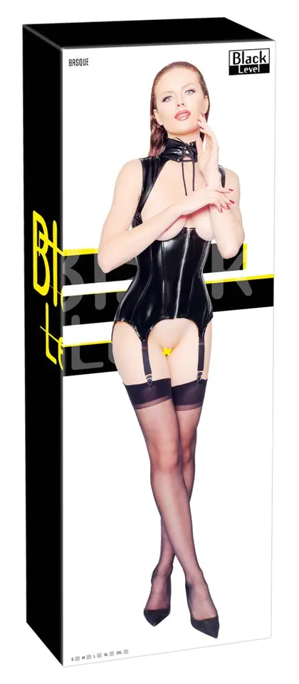 Vinyl bodysuit with bare breasts, fastened at the neck. Lace-up around the neck and back. Full length zipper fastening on the front. Body stiffened with underwire. Four adjustable garter straps. Colour: black. Material: 100% polyester with polyurethane coating. There are no thong and stockings included.
