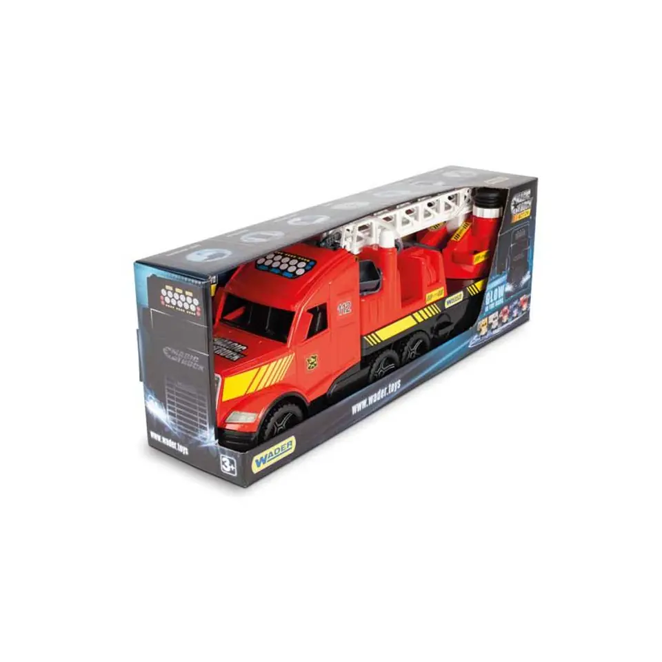 Magic Truck Action - Fire brigade as befits a real fire engine, it has an extendable, movable ladder, at the end of which there is a basket for a firefighter, a pump and a hose from which, after filling the tank, water gushes. Rotating elements mean that the water jet can be directed in any direction. The torsional semi-trailer can be attached to the cabin in two ways, so the car can reach a length of 80 cm. In addition, it has been equipped with retractable support legs, so it can also stand alone. The front car has fluorescent lights that glow in the dark when exposed to light. The vehicle is made of materials safe for children. The great advantage is the durability and strength of the structure, which means that the toy can be used by children for years.