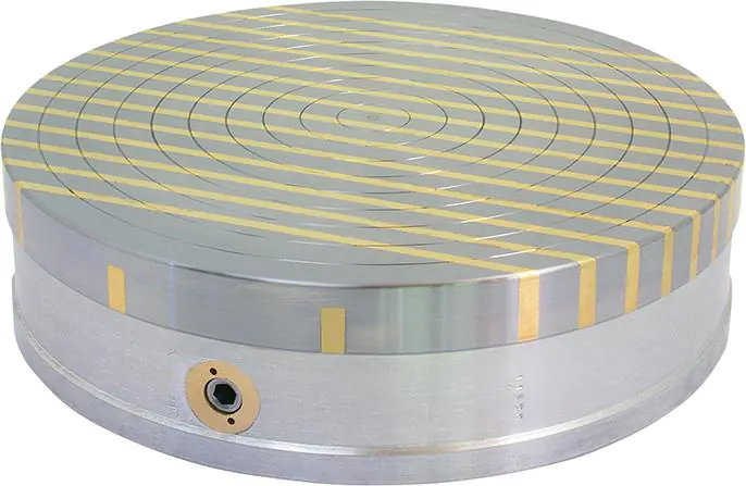 Design: round magnetic holder with reinforced fastening system using ferrite magnets and with aluminum body. The magnet strength is infinitely adjustable. The centering grooves profiled in the surface facilitate the positioning of the workpiece. Additionally, you can drill a centering hole in the mounting surface. Processing of the top plate without negative impact on its operation is possible up to a depth of 8 mm.
