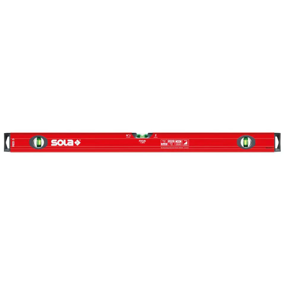 Design: light metal rectangular profile, shock absorbing plugs. Libella blocks made of acrylic glass with a magnifying lens (+60%). Improved readability in twilight thanks to the glowing coating. Accuracy in the normal position: 0.3 mm/m, accuracy in the inverted position: 0.5 mm/m.