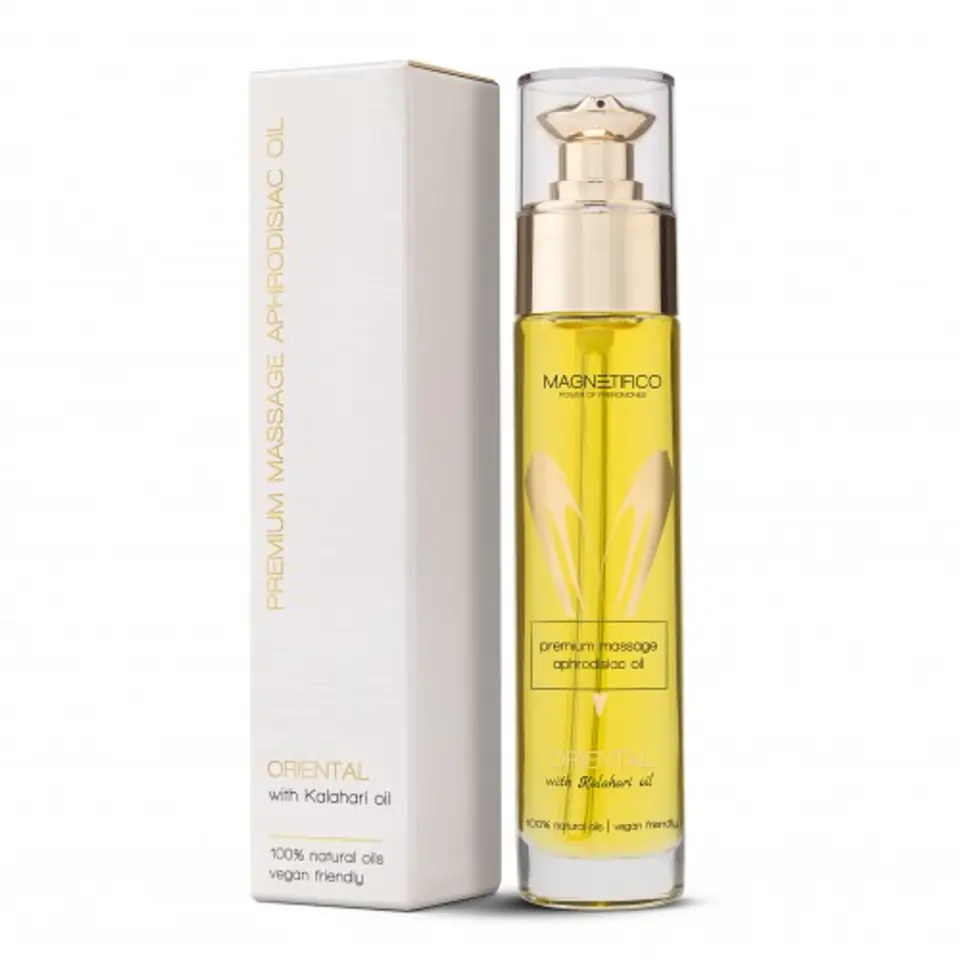 Magnetifico Premium Massage Aphrodisiac Oil Oriental to niezwykle zmysłowy olejek stworzony z myślą o namiętnym masażu ciała. Jego intensywny, orientalny aromat działa jak naturalny afrodyzjak, pobudzając zmysły i wprowadzając w stan głębokiego relaksu. Dzięki lekkiej konsystencji rozprowadza się bez wysiłku, zapewniając długotrwały poślizg bez uczucia tłustości. Skóra po masażu staje się miękka, elastyczna i otulona ciepłym zapachem pożądania.