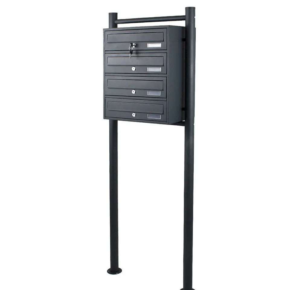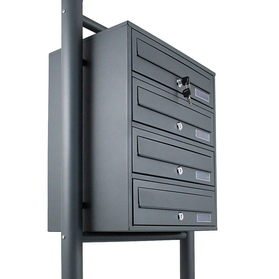 Thanks to its timeless, elegant design and stainless steel design, the Euro letterbox system is perfect for companies and housing estates. Due to its compact design, the 4-box letterbox system takes up little space. Installation is thus easy and fast. The scope of delivery includes mounting materials for concrete foundations.