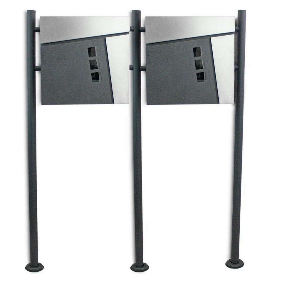Podwójna i nowoczesna skrzynka na listy na stojaku jest odporna na opady atmosferyczne. Skrzynka pocztowa jest wykonana ze stali nierdzewnej, a grubość ścianek to około 0,8mm. Skrzynki posiadają otwory z tyłu, które pozwolą na łatwy montaż do słupków. Designerski wygląd zagwarantuje dbałość oraz styl na Twojej posesji.