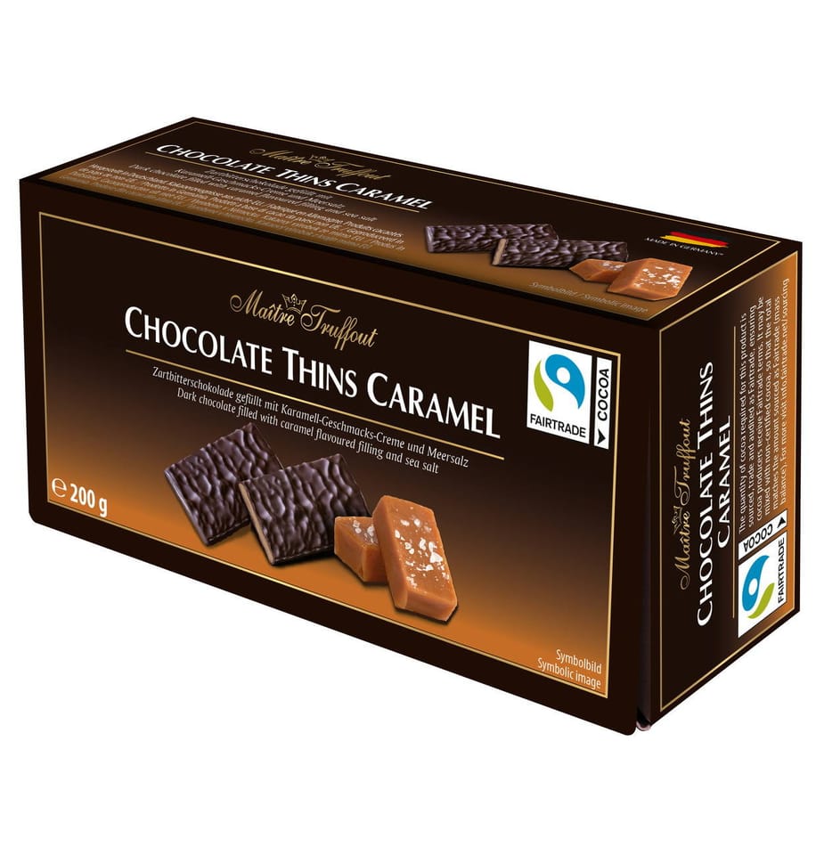 Thin chocolate slices from Maitre Truffout. On the outside, the most delicate dark chocolate, and inside the filling of fondant with a taste of salty caramel. A noble gift idea for any occasion or pleasure.