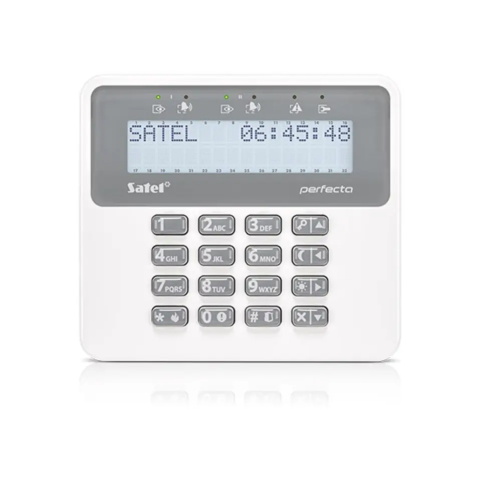 PRF-LCD-WRL is a wireless keypad used for daily operation of PERFECTA 16-WRL, PERFECTA 32-WRL and PERFECTA-T 32-WRL control panels. Encrypted communication with the control panel takes place in two directions, in the 433 MHz band. The device meets the Grade 2 safety requirements specified in EN 50131. Large keys, LCD display and LEDs indicating the status of the system make the operation of the system convenient and transparent for all users. The keyboard, in addition to the numeric keys, also has buttons that allow you to quickly turn on the selected surveillance mode (day, night, full) and trigger three alarms: assault, fire, help. The attractive appearance of the PRF-LCD-WRL keypad makes it suitable for interior design protected by the system.
