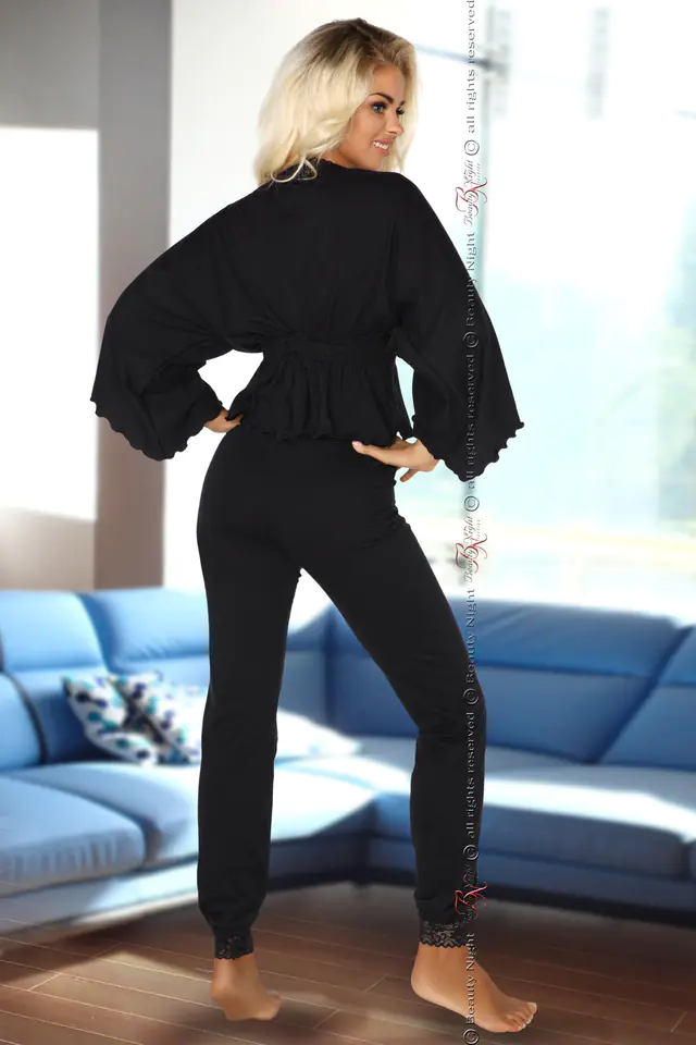 Dwuczęściowy sexy komplet z miłej w dotyku bawełny i eleganckiej koronki. Może być zarówno piżamką jak i domowym strojem. Fantazyjnie skrojona, krótka koszulka z szerokimi rękawami zalotnie odsłania talię. Długie, wygodne spodnie wykończone koronkowym ściągaczem oraz wiązane u góry na troczek. Całość spakowana w eleganckie opakowanie ze zdjęciem przedstawiającym produkt.
