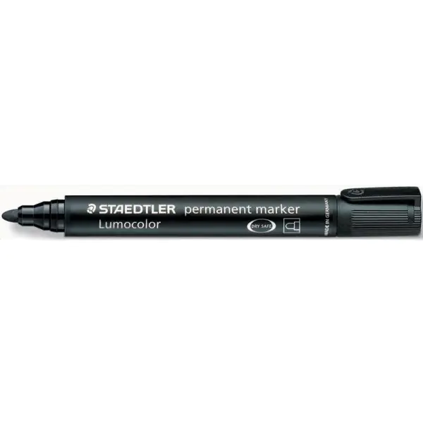 Marker Lumocolor_ permanent - does not smudge and is waterproof on most surfaces, - quick-drying, also ideal for left-handed people, - ink with the DRY SAFE formula: can remain without a cap for several days and does not dry out (ISO 554 test), - resistant to fading (on paper black and green colors for up to 10 years), - black and green are resistant to weather conditions, - practically odourless, - with a clip, - strong tip, - housing and cap made of PP guarantee high resistance to damage, - can be used during an airplane flight _ automatic pressure equalization protects pens from spilling ink during flight; - 2 line thicknesses: round tip approx. 2 mm, bevelled tip approx. 2 or 5 mm