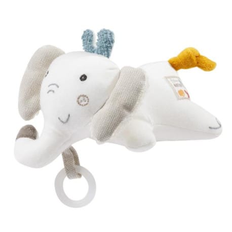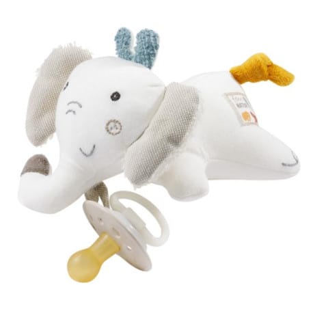 Mascot, Paciless pendant, Elephant, from the collection: Mascot, Paciless pendant, Elephant, from the collection: NatureCollection Natura combines excellent quality of natural materials with unique design, consistently focuses on ecology. The products in this collection use pure, certified organic cotton as the face material. The filling consists of PLA fibers. All materials used in toys are of natural origin. The only plastics used in the mascots are hidden inside and inaccessible to children. A cute mascot, a pacifier tag depicting an Elephant, will help solve the problem of a dying pacifier! The plush mascot has a handle for attaching the pacifier. Easy to grasp, supports curiosity and enlivens touch. It will certainly become a must-have during walks, travels and everyday discovering the world. The mascot is soft and pleasant to the touch. It will solve the problem of a dying pacifier. The practical silicone fastening ring can be attached to all common teats with or without handles. The cute Elephant is so soft that it can act as a cuddly toy. Shell: certified organic cotton. Filling: PLA fibers. Washable at 30C. Dimensions: 14 cm. Package dimensions: 23 cm x 19 cm x 5 cm. All toys of the German brand FEHN are safe for children from 0+. They are made of the best quality materials. They meet EN71, CE standards, tested for safety by independent testing institutes. 56181