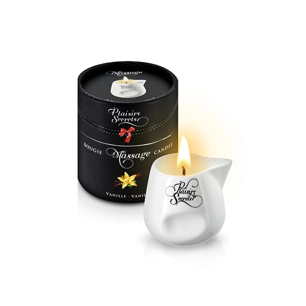 Vanilla scent massage candle in a decorative ceramic jar with a pointed tip for easy pouring. After lighting the candle, the wax warms up and turns into an aromatic massage oil.