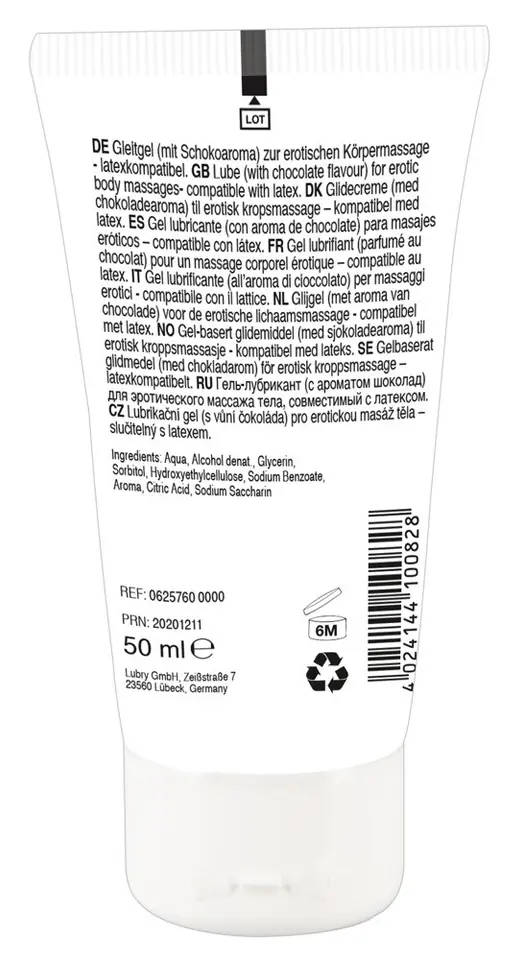Vegan water-based gel with the smell and taste of chocolate. For erotic massage of the whole body. Capacity 50 ml.Sk loaders: Aqua, Alcohol Denat, Glycerin, Sorbitol, Hydroxyethylcellulose, Sodium Benzoate, Propylene Glycol, Citric Acid, Aroma, Sodium Saccharin