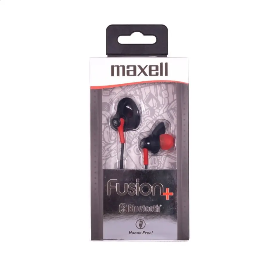 Wireless headphones for active people Maxell EB-BTFUS9 FUSION + with microphone.Designed for runners.They have volume control on the remote control and a call answering / playback / pause button.Charging from the USB portEasier pairing thanks to the LED diode.Durable battery with 3,5h autonomy.Technical parameters:Impedance Ohm 16 OhmFrequency response 20 Hz -20 KHzSensitivity 102 dBDiameter of the loudspeaker 10 dBBuilt-in microphone yesBluetooth version V4.2Range up to 10mUSB DC 5V Input power supplyBattery life [h] 3.5 hoursCharging time [h] 2.5 hours