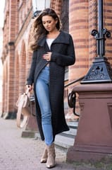 Dzianinowy sweter-płaszczyk. Z boku przydatne kieszenie. Klasyczny, prosty fason.