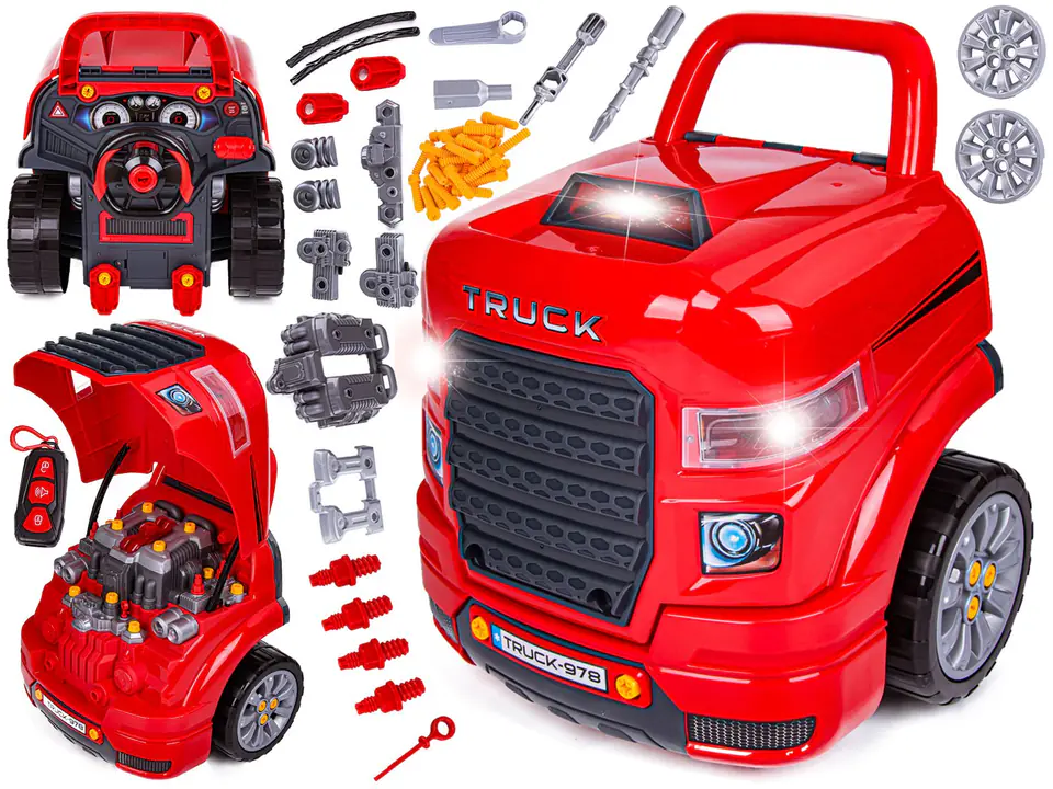 The unscrewed truck engine is the perfect toy for little DIY enthusiasts. This set develops creativity, logical thinking and manual skills. The set includes a lot of parts, m.in front wheels with rims, engine components, bolts.