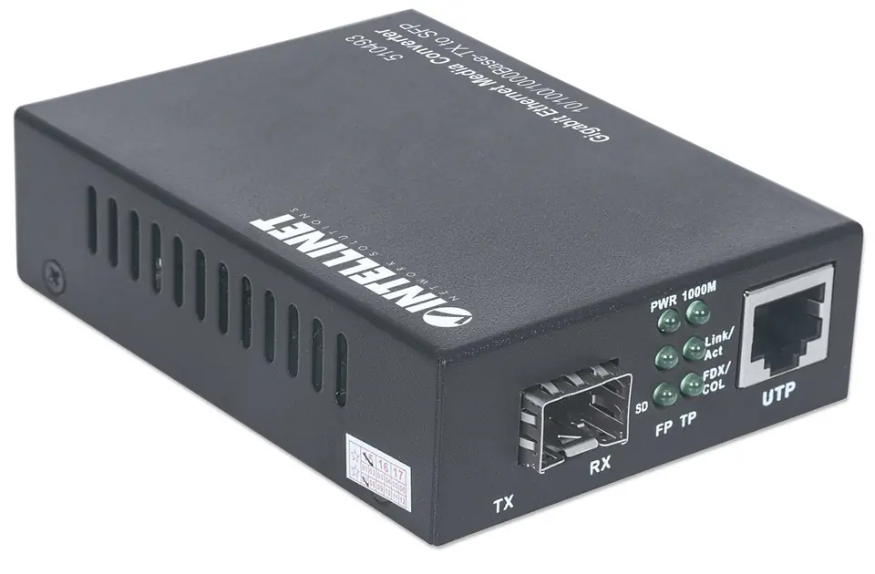 Konwenter with LEDs. The device has RJ-45 port connectors , 1000Base-T, SFP module slot.