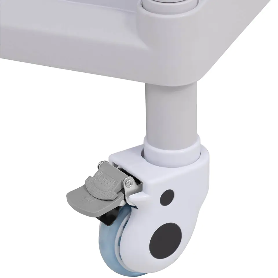 The treatment trolley from Steinberg Systems allows you to store the most necessary equipment at your fingertips: tripods, test tubes, liquids or paper towels. The trolley is equipped with 3 shelves measuring 65 x 46 x 14 cm. Three-sided bezel prevents things from slipping off. Two drawers measuring 18 x 35 x 8 cm provide additional storage space. On the side tube there is a 360 rotating trash can. 4 wheels made of plastic (ABS + PVC) ensure convenient movement of the helper and do not scratch the floors. Two parking brakes provide the necessary stability. The load capacity of the trolley is 60 kg. The structure is made of steel tubes and the shelves are made of plastic.