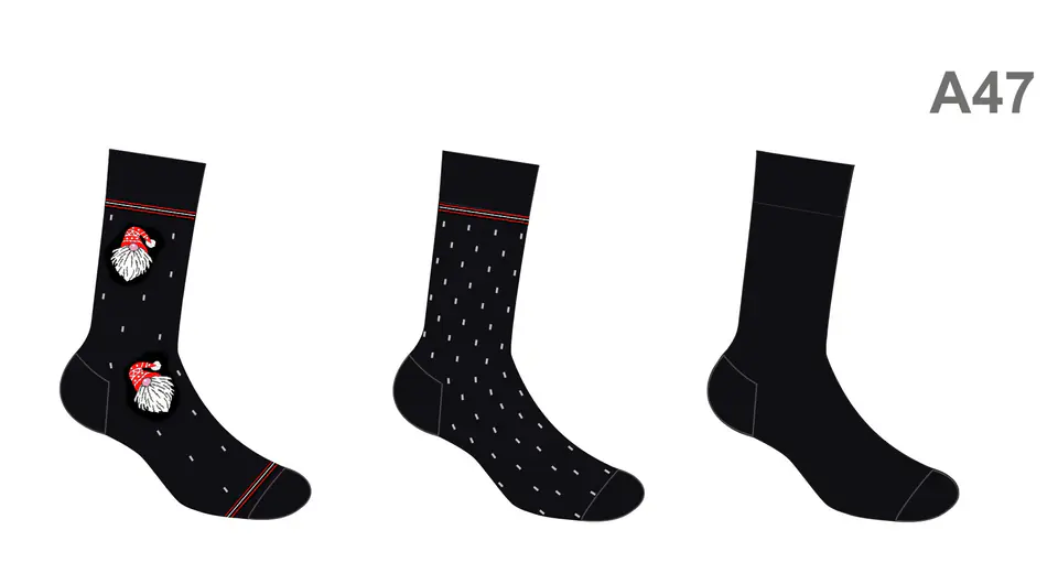 Black men's socks in a three-pack, from the Christmas edition of the Cornette brand. Cotton, with comfortable, flat seams, with a contoured heel that increases the comfort of use. Packed in a box. Composition: 74% cotton, 23% polyamide, 3% elastane.
