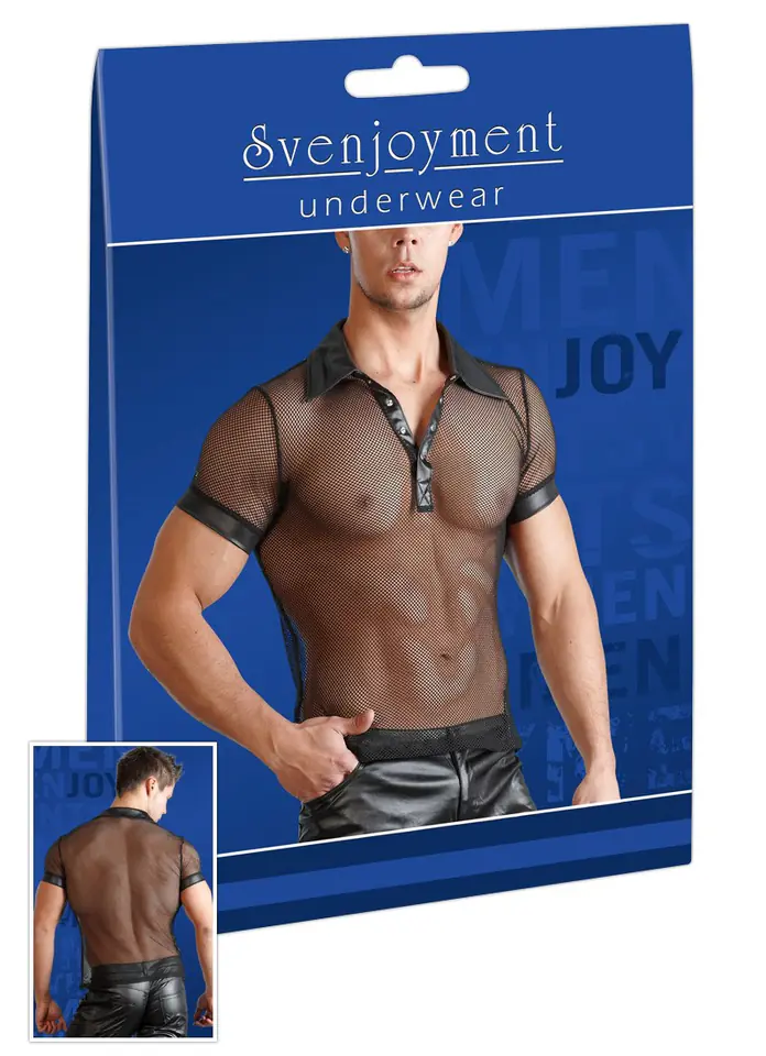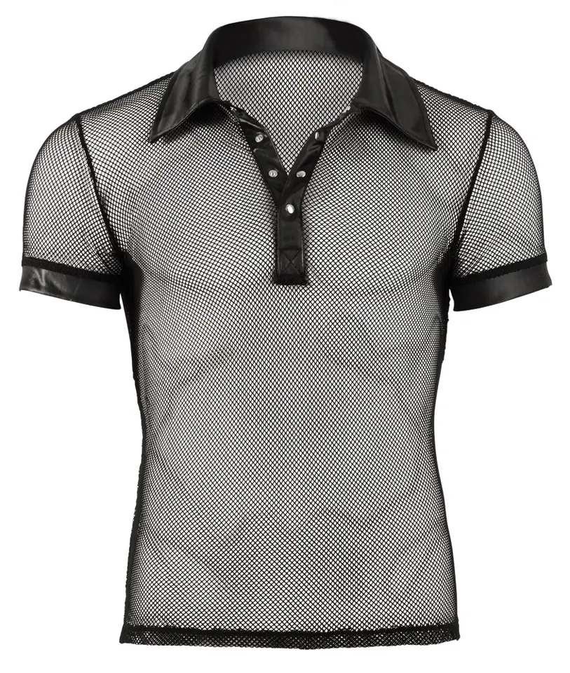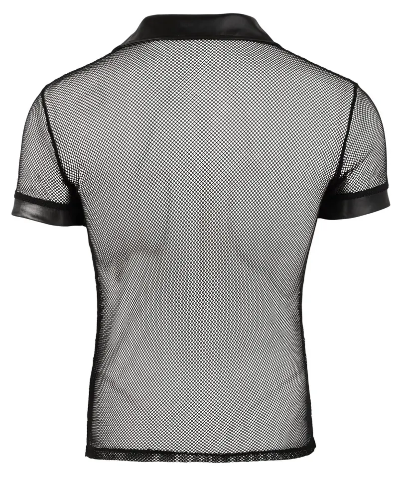 A seductive mix of materials (mesh and wetlook) in black with collar and snap fastening at the front. 100% polyester.