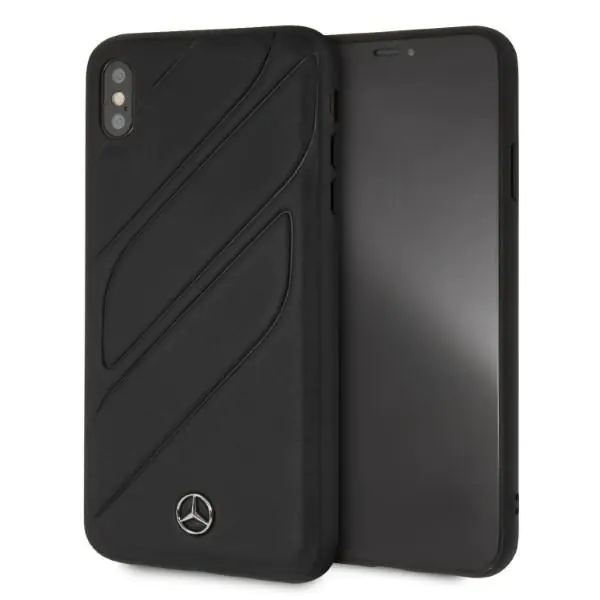 - Skórzane etui ozdobione metalicznym logiem Mercedes-Benz i minimalistycznym wzorem zyskuje efekt trójwymiarowości