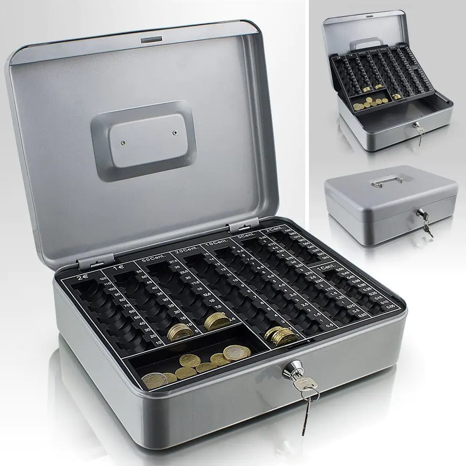 Brand new, high-quality metal case for storing or transporting coins, banknotes or other valuables. A sturdy and handy metal case equipped with a coin sorter is an ideal place to store banknotes and coins. At the bottom there is a lot of space for bills, receipts, coins, banknotes and other useful items, for example. For safety, the case is locked. The ergonomic handle makes transport child's play.