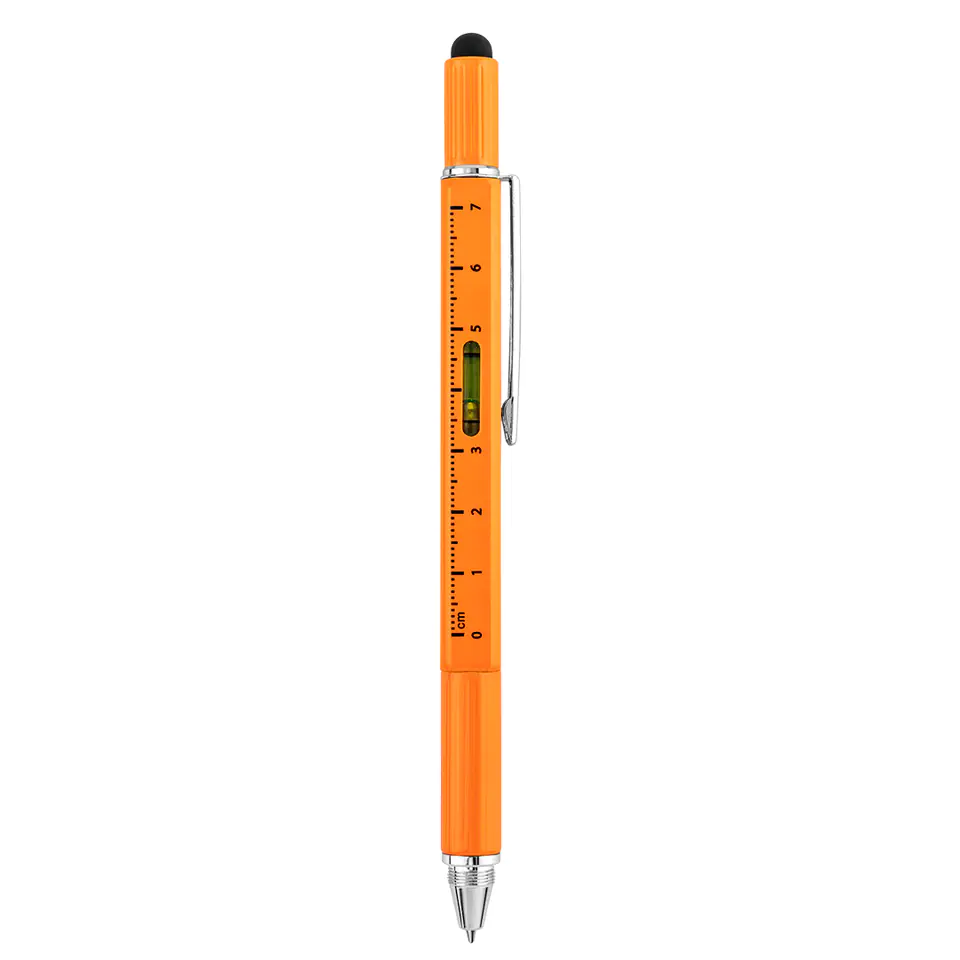 5 in 1 metal pen, functions: pen with blue insert, ruler, spirit level, stylus, screwdriver (flat and Phillips), orange, packed in black case