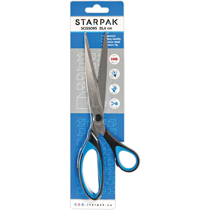 Scissors with a perfect stainless steel blade of the highest quality. The ergonomic, very comfortable rubberized handle ensures precision and optimizes the force used for cutting. Eagerly bought both for the office and home. Packed in attractive blisters.