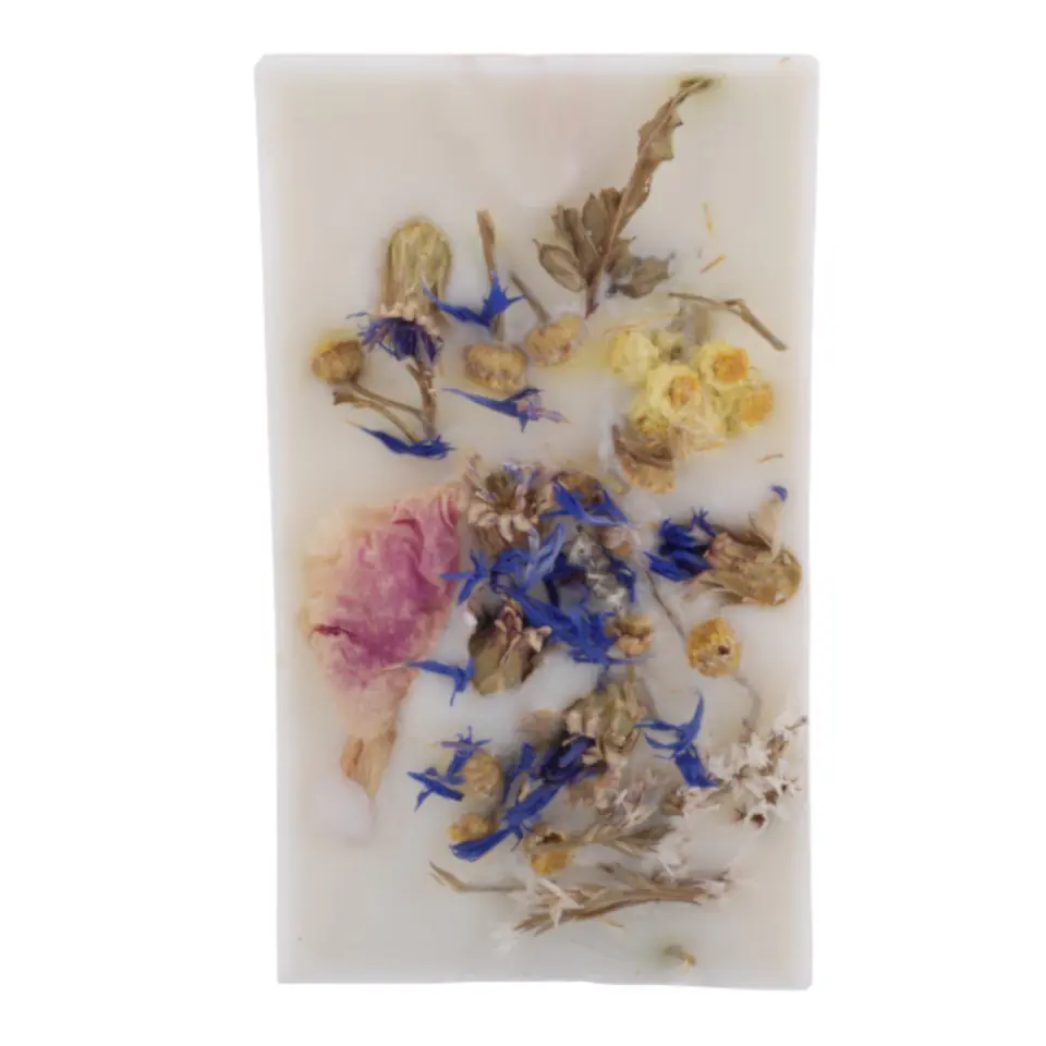 soy wax (90%), shea butter, fragrance oils, dried flowers, fruits, herbs, grains.