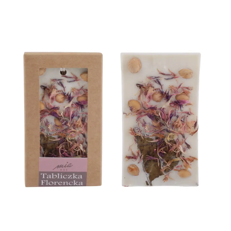 Hand-made, unique soy wax plate with the addition of fragrance oils, shea butter, dried flowers, fruits, herbs, grains and other ecological decorations. Slowly releasing its beautiful fragrance, it aromatizes rooms and improves mood. It is an aesthetic carrier of wonderful fragrance notes, which at the same time serve as unique elements of decoration. The Florentine plate is a natural, ecological replacement for synthetic fragrance hangers for a wide range of applications. Place it on a chest of drawers, hang it in the bathroom, put it in a drawer or closet, and its interior will be filled with a beautiful, seductive fragrance. This is a wonderful gift, original and unique. No two plates are the same. Their execution is 100% handmade;).