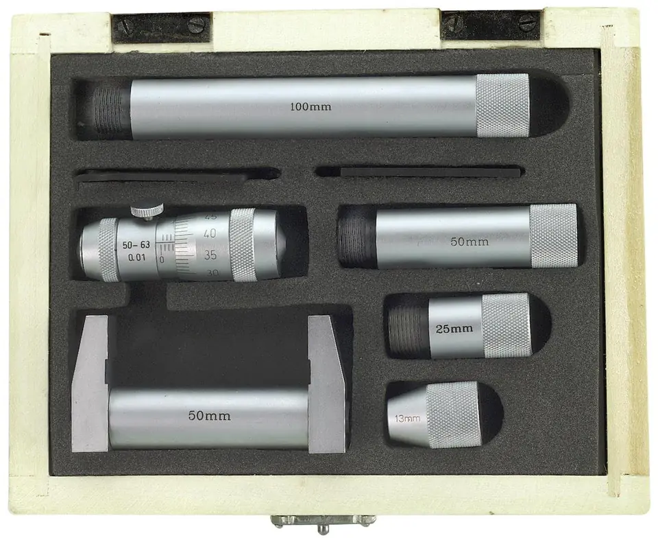 Chrome graduation on matt. It consists of a micrometer head and corresponding extension sleeves. DIN 863.