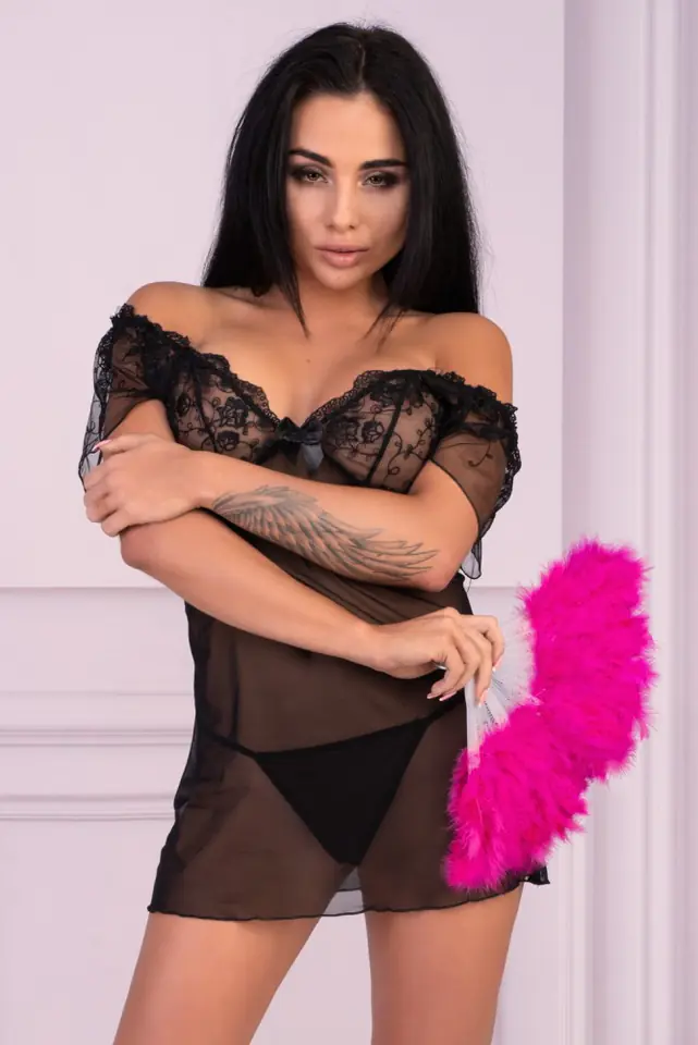 Black, it has that something. And if you combine it with sensual nightwear, it gives a unique effect. Here as an airy night hook with beautifully embroidered bowls. It definitely catches the eye. Sleeves look cute. Tulle elastic, translucent, tempts the look. Your man will certainly not be able to take his eyes off you... In the set you will receive a thongs for free.
