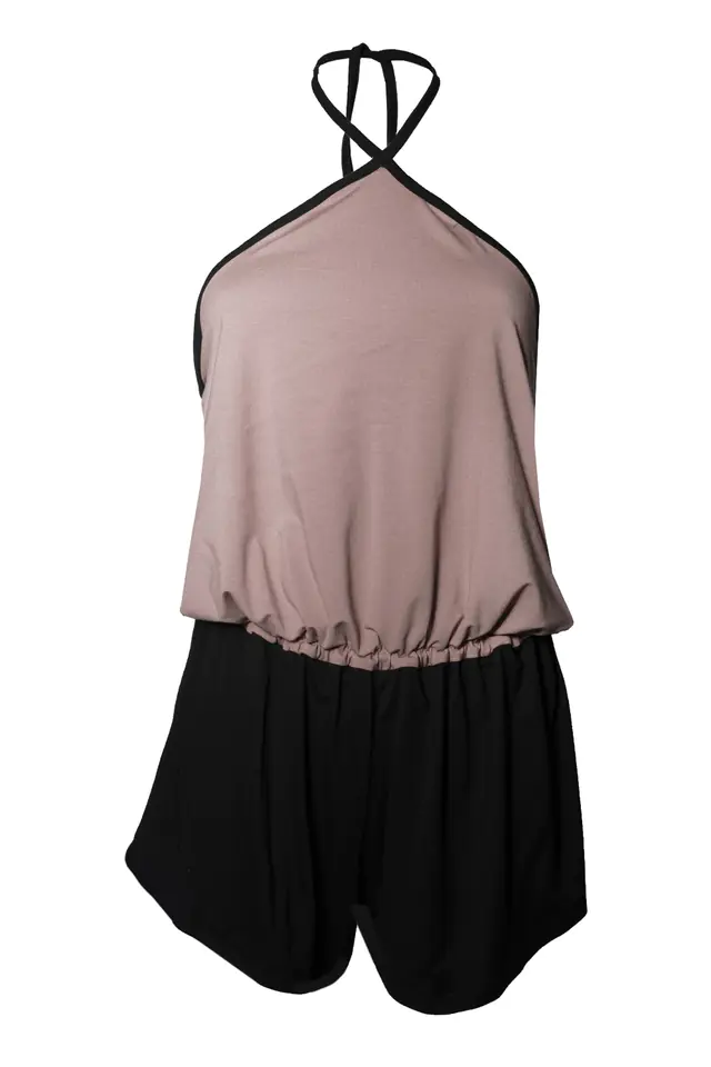 ZMYSŁOWY WISKOZOWY KOMBINEZON Z KRÓTKIMI SPODENKAMI, WYKONANY Z MIĘKKIEJ W DOTYKU WISKOZOWEJ DZIANINY. W PASIE ODCIĘTY GUMKĄ,KTÓRA POZWALA NA ODPOWIEDNIE DOPASOWANIE. GÓRA WYKOŃCZONA CZARNĄ WISKOZOWĄ LAMÓWKĄ, WIĄZANY NA SZYI. DOSTĘPNA WERSJA KOLORYSTYCZNA ZAWSZE Z CZARNYM DOŁEM