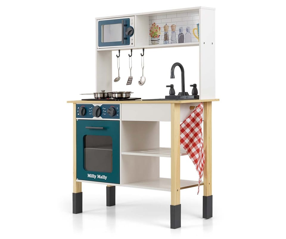 Zapraszamy najmłodszych do smakowitego świata kulinarnych przygód z naszą drewnianą kuchenią, pełną uroczych detali i niekończącej się frajdy!Astrid od Milly Mally zachwyca połączeniem bieli, naturalnego drewna z wyrazistymi kolorami. Jest wyposażona w zestaw przyborów kuchennych. Doskonale wzbogaci posiadane już zabawki do gotowania czy zabawy w dom.Drewniana kuchnia to wymarzony mebel dla małego kucharza. Dzieci naśladują rodziców – dlatego też chcą tak jak mama, tata lub babcia przygotowywać smakołyki dla całej rodziny.Kuchnia posiada piekarnik z uchylanymi drzwiami i okienkiem z pleksi, „blachę” i 3 klikające pokrętła. Obok piekarnika znajdują się dwie półki. Na blacie umieszczona została elektryczna płyta kuchenna z dwoma polami grzejnymi i przyciskami uruchamiającymi dźwięk gotującej się wody i smażenia oraz podświetlenie palników. Jest też, jednokomorowy zlew z ruchomym kranem i gałkami od wody. Nad płytą znajdują się 3 haczyki. Powyżej, umieszczona została mikrofalówka z otwieranymi drzwiami, okienkiem z przeźroczystej pleksi i klikającym pokrętłem, żeby mały kucharz widział umieszczone w niej produktu. Natomiast, nad zlewem znajduje się pojemna półka.Marka Milly Mally postawiała na bogate wyposażenie tej drewnianej kuchni w tym: patelnię z pokrywką, garnek, metalową płaską łopatkę i podbierak oraz czerpak które można zawiesić na haczykach nad płytą. Wszystkie akcesoria są dobrze dobrane, a schowki są wystarczająco duże, aby dzieci mogły przechowywać własne jedzenie. To doskonała okazja, aby Twoje dziecko nauczyło się także odpowiedzialności za własną kuchnię i sprzątania poprzez zabawę. Ta zabawka to wspaniały zestaw do zabawy. Maluchy zdobywają podstawową wiedzę na temat gotowania, jedzenia i przygotowywania posiłków- nie wykluczone, że Wasze dziecko zdobędzie tytuł rodzinnego „MasterChef”. Odtwarzanie sytuacji znanych dziecku z codziennych obserwacji pozytywnie wpływa na wszechstronny rozwój dziecka, rozwijaniu umiejętności społecznych, zabawy z rówieśnikami oraz rozwiązywania problemów. Nasza drewniana kuchnia Astrid z akcesoriami to nie tylko zabawka, ale i jedno z fundamentalnych narzędzi wspierających rozwój dziecka. Solidne wykonanie, realistyczne detale oraz edukacyjny aspekt zabawy sprawiają, że ta drewniana kuchnia stanie się ulubioną zabawką dla dzieci, dzięki której będą mogły rozwijać swoje kuchenne umiejętności w bezpieczny i atrakcyjny sposób. Zabawa nigdy nie była tak kolorowa i pełna radości! Kuchnia rośnie wraz z dzieckiem poprzez zastosowanie regulowanych dostawek do nóżek. Kuchnia rośnie wraz z dzieckiem poprzez zastosowanie regulowanych dostawek do nóżek. CHARAKTERYSTYKA:- Elektryczna płyta z 2 podświetlanymi polami grzejnymi i przyciskami uruchamiającymi i dźwięk gotującej się wody i smażenia- Otwierany piekarnik z okienkiem z pleksi i „blachą” oraz 3 klikającymi pokrętłami- 3 haczyki nad płytą grzewczą- Mikrofalówka z okienkiem z pleksi i klikającym pokrętłem- 2 duże pułki obok piekarnika- Zlewozmywak z kranem i pokrętłami- Stalowe akcesoria: garnek z pokrywką, patelnia, łopatka, czerpak i łyżka cedzakowa- Półka nad zlewem- Ściereczka kuchenna- Dedykowany drewniany haczyk na ściereczkę - 3 stopniowa regulacja wysokości kuchni- Baterie do płyty 2 x AAA- brak w zestawieZ TEJ SERII POLECAMY:- Milly Mally Zestaw mebli - Stolik i dwa krzesełka Sven: White, Grey i Natural- Milly Mally Zestaw mebli Olaf - Stolik i dwa krzesełka: Grey, White i Dark Grey- Milly Mally Zestaw mebli Stella 3w1 Grey i NaturalNaszym priorytetem jest bezpieczeństwo i jakość oferowanych produktów, dlatego dbamy o to, aby farby, którymi malujemy nasze zabawki nie były toksyczne i spełniały normy bezpieczeństwa.Przed podaniem dziecku zapoznaj się z instrukcją.Zabawka przeznaczona dla dzieci powyżej 3 roku życia.WYMIARY PRODUKTU:- Długość: 70 cm- Wysokość: 89/94/ 96 cm - Szerokość: 30 cm- Wysokość do blatu: 48/53/55 cm- Wymiary mikrofalówki: 25 x 14,5 x 10 cm- Wymiary piekarnika: 28,5 x 29 x 26,5 cm- Wymiary płyty grzewczej: 24,5 x 18 cm- Średnica patelni: 9,7 cm- Średnica garnka: 10 cm- Waga netto: 7,8 kgWYMIARY OPAKOWANIA:Dł. 79 cm x wys. 37 cm x szer. 15,5 cmWaga: 9,3 kgOpisy