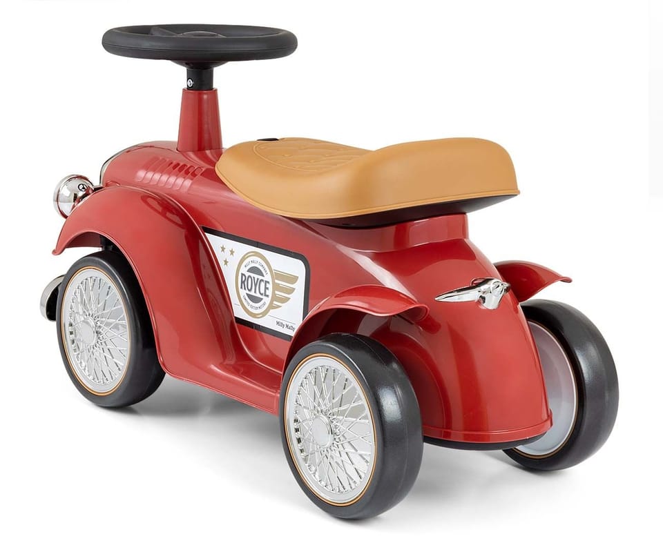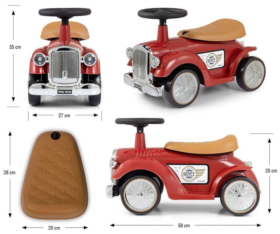 Vintage Pojazd Royce by Milly Mally zaprasza w retro przejażdżkę małego podróżnika. Przyciąga miłą dla oka kolorystyką. Pojazd Royce jest bogato wyposażony. Ten mały samochód ma kierownicę z dźwiękiem oraz wyprofilowane siedzisko w pięknym jasno brązowym kolorze. Zapewnia dziecku wspaniałą radość z jazdy, rozwija zmysł równowagi i ogólną sprawność motoryczną. Samochód ma lekką plastikową konstrukcję i ergonomiczne kształty, co zapewnia dziecku bezpieczną zabawę. Skrętna kierownica naszego jeździka Royce pozwala na wykonywanie trudnych manewrów w domu oraz na spacerze. Koła tego pięknego pojazdu wykonanie są z miękkiej pianki EVA. Zabawa poprzez aktywność ruchową, jest wspaniałym sposobem wspomagającym prawidłowy rozwój naszych pociech. Retro autko może posłużyć dziecku jako pierwszy pojazd z prawdziwą kierownicą i klaksonem, również jako pchacz z otwieranym schowkiem na zabawki (mały bagażnik), na tyle pojazdu umieszczoną imitacją wlewu paliwa, a przednia część autka- grill jest w kolorze srebrnym. Estetyki i prestiżu dla tego pojazdu dodaje jego logo ROYCE. Uwieńczeniem wykonania jeździka Royce by Milly Mally jest jego opakowanie prezentowe utrzymane w charakterystyce retro pojazdów z początku powstania motoryzacji. Pojazd Royce jest dedykowany dla wszystkich dzieci, które potrafią samodzielnie siedzieć. Pojazd można używać zarówno w pomieszczeniu jak i na zewnątrz, a na spacerze będzie umilać czas dziecku.Korzystanie z produktu pod nadzorem osoby dorosłej.CHARAKTERYSTYKA PRODUKTU: