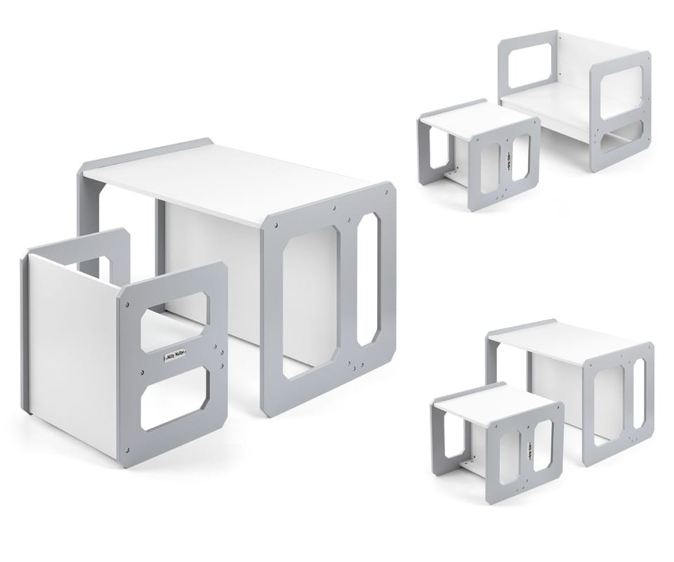 Zestaw wielofunkcyjnych mebli dla dzieci. Zestaw mebli 3w1 Stella utrzymany w kolorystyce bieli i szarości z szarymi akcesoriami, wykonany z myślą o zapewnieniu dzieciom: wygody, przestrzeni do kreatywnej zabawy, malowania, pisania oraz zapewnieniu maksymalnego komfortu podczas zajęć. Zestaw składa się z jednego stolika i jednego krzesełka, które dzięki modułowej konstrukcji mogą pełnić różne funkcje – stolik można zamienić w większe siedzisko, a krzesełko doskonale sprawdzi się jako mniejszy stoliczek lub siedzisko bez oparcia dla starszego dziecka. Dzięki swojej lekkiej konstrukcji, meble te są łatwe do przenoszenia, co umożliwia dzieciom samodzielne dostosowanie ich do swoich potrzeb. Krzesełko jest lekkie i dzieci mogą je swobodnie przenosić.