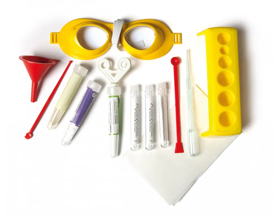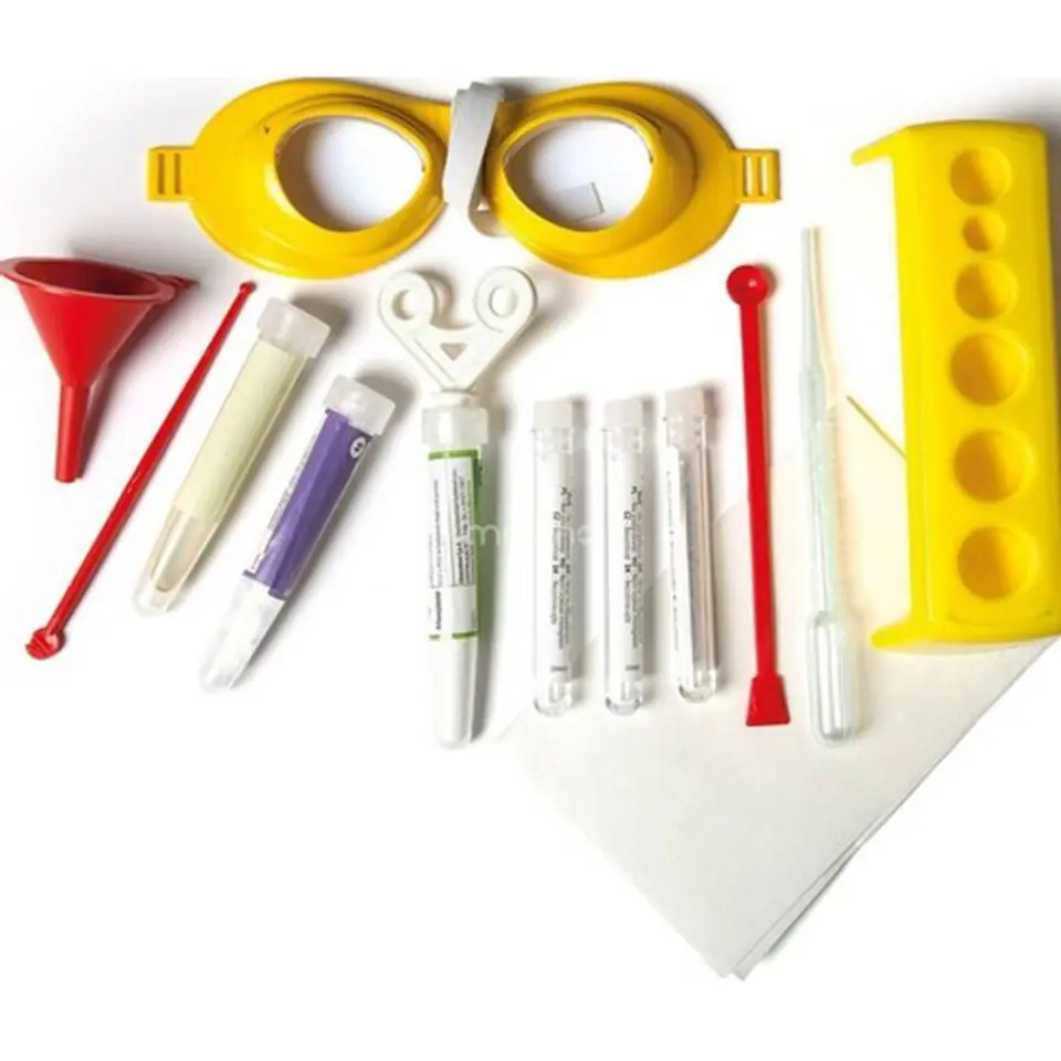 It contains a complete set of laboratory instruments and many other substances for observation, experimentation and real chemical reactions.