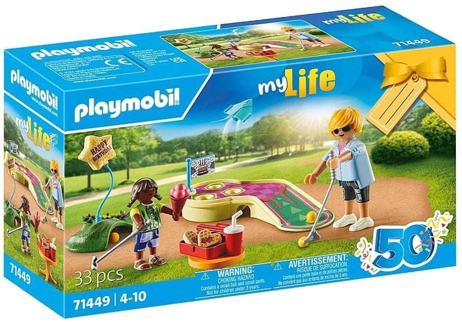 Endless play fun awaits Mini Golf fans with the fantastic PLAYMOBIL Mini Golf Gift Set. Thanks to the decorative packaging that can be personalised with the birthday child's name, you save on gift wrap. The Mini Golf course offers plenty of excitement: the front area allows for the perfect ball placement for tee-off, while on the upper level, three additional holes serve as targets. The passage beneath the course can double as a tunnel, and the hill serves as an extra challenge. In the two-part container, you can store the sweet waffle hearts, while the golf clubs, paper airplane, ice cream cone, beverage cup, and balloon string have practical handles and can be held by the figures.
