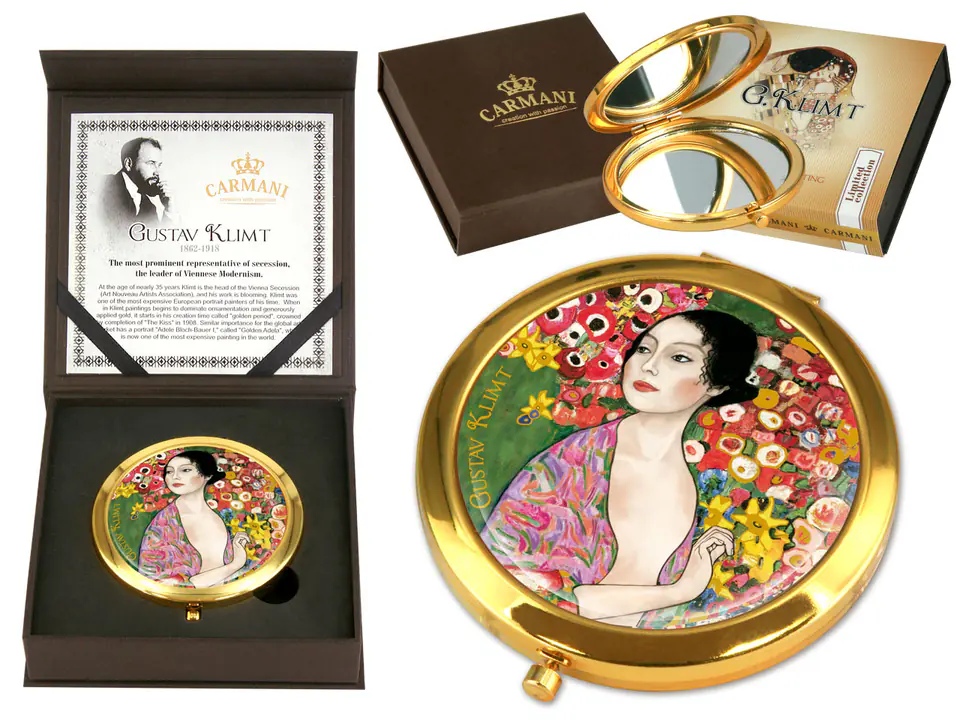 A charming little mirror with a motif of Gustav Klimt's work. Perfect for any female handbag. It takes up little space and its beautiful decorations add charm.