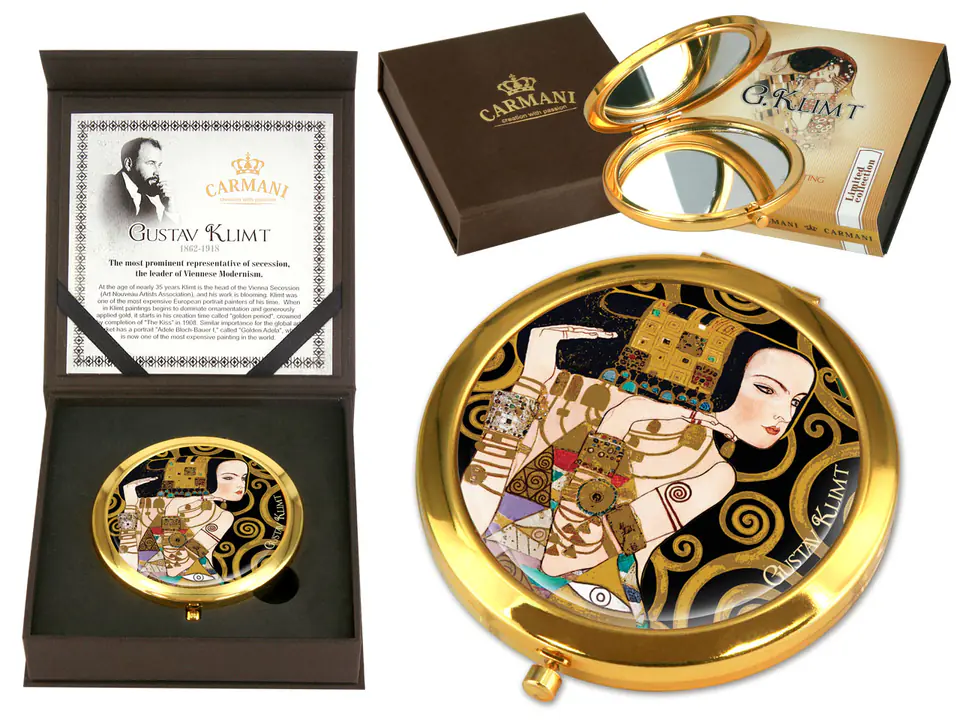 A charming, small mirror with a motif of Gustav Klimt's work. Perfect for any feminine handbag. It takes up little space and its beautiful decorations add charm.