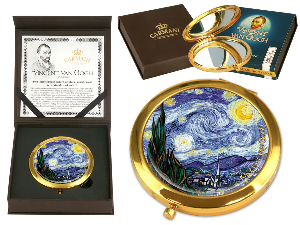 A charming little mirror with a motif of Vincent van Gogh's work. Perfect for any female handbag. It takes up little space and its beautiful decorations add charm.