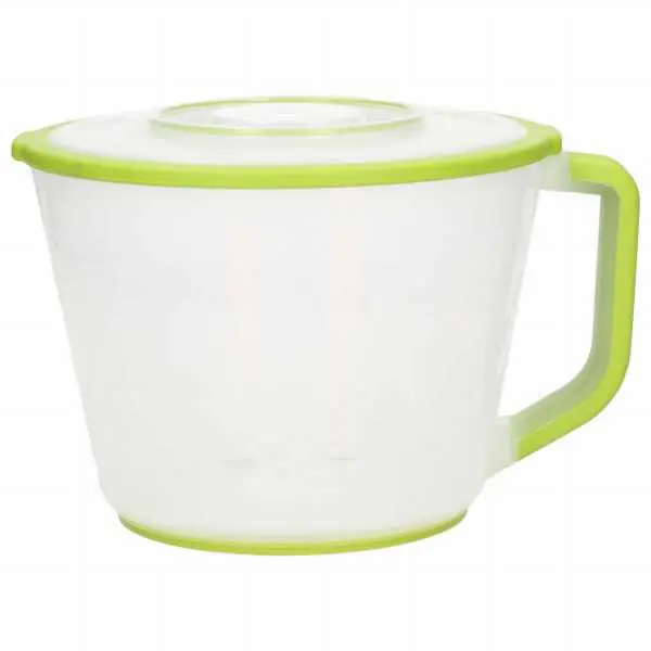 Mixing jug with measuring tape and lid 2l Daisy Practical and aesthetically made. It has a lid, the central part of which can be removed, for example during mixing, to avoid splashing mixed ingredients. Special Features: Volume: 2,0 l, Height: 13,5 cm, Upper diameter: 17,5 cm, Lid hole diameter: 9,5 cm, Base diameter: 12,5 cm, Made of plastic, Colour: transparent, green, Usage: Food contact,