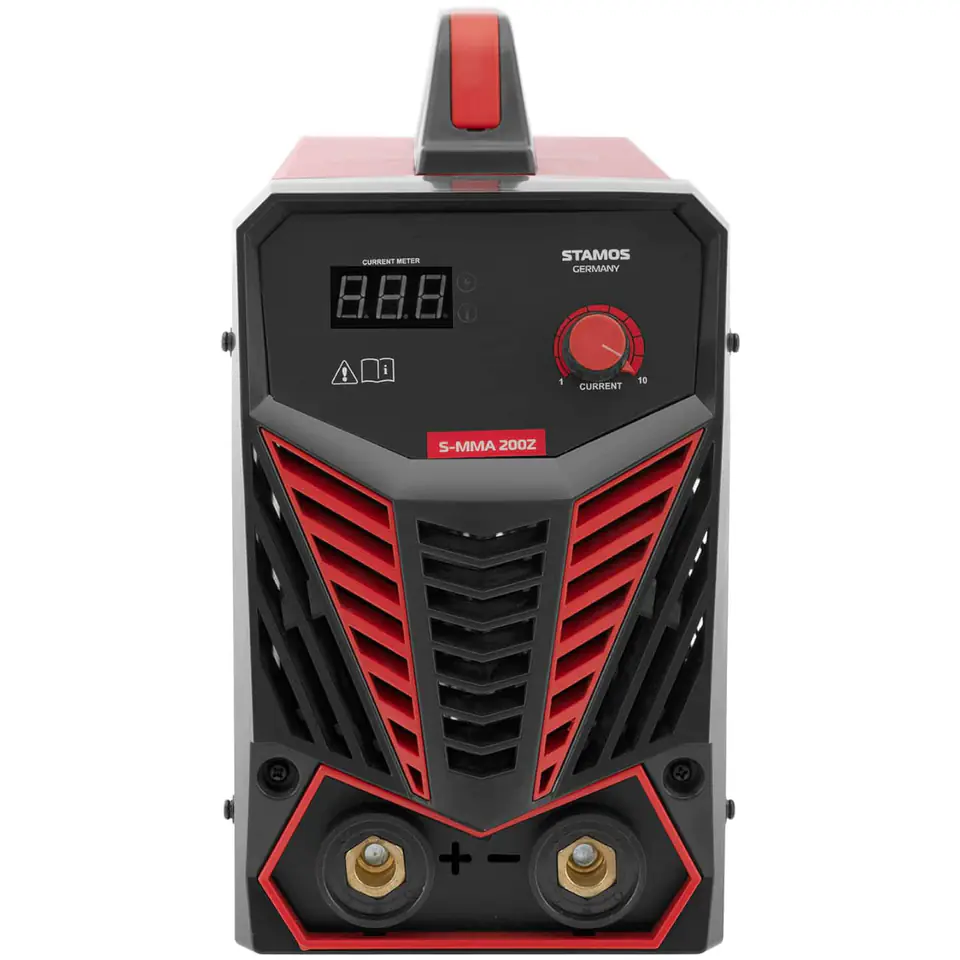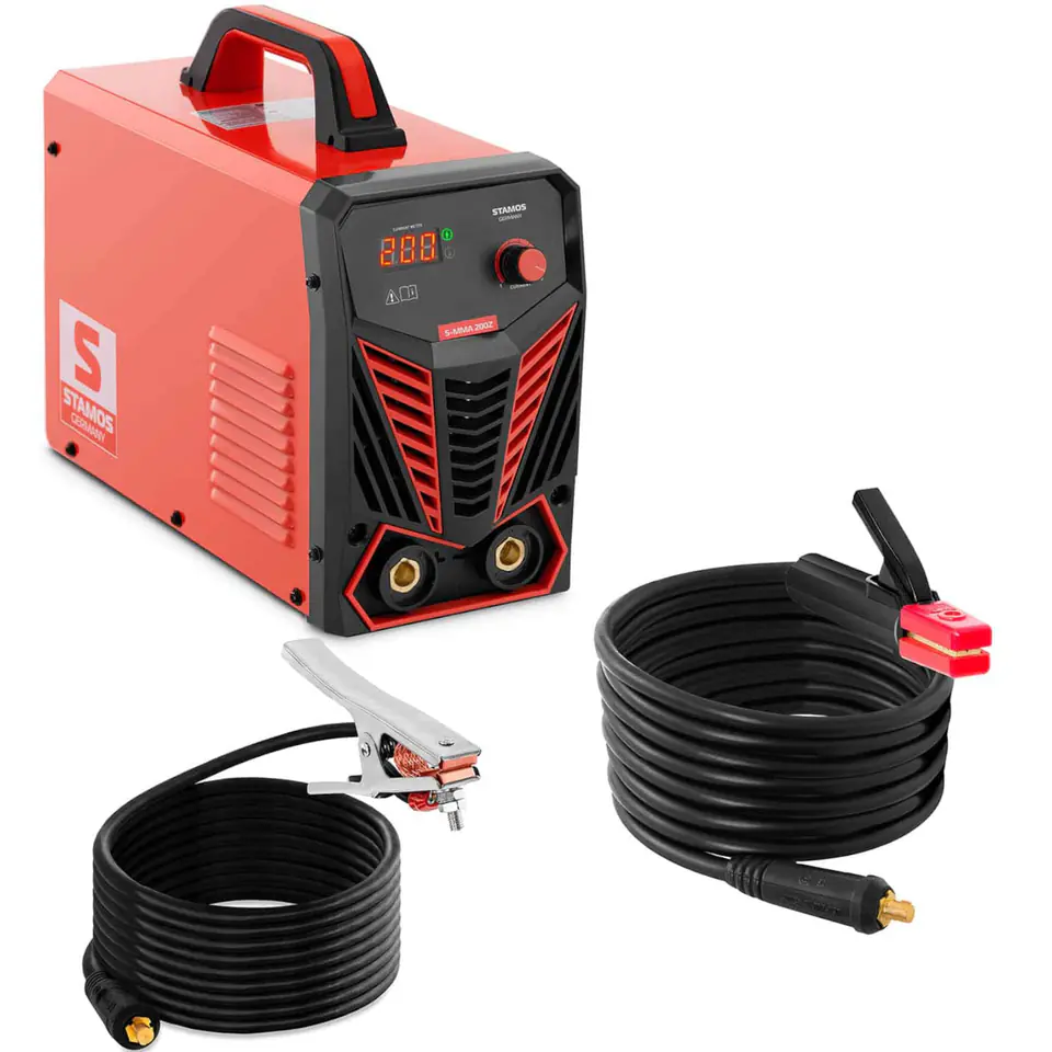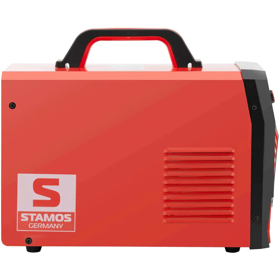 Stamos Germany welding machine is a handy device for welding with a coated electrode with 8 m long wires. The welding current is selected in the range of 20-200 A using a knob. To achieve a 100% duty cycle, the welding current must be adjusted below 110 A. An easy-to-read LED display allows you to check the set values. Long, 8 m welding and grounding cables provide maximum freedom of movement. To quickly make clean and strong welds with reduced splash, use acid or alkaline electrodes with a diameter of 1.6-5 mm. The device is designed for welds with a thickness of up to 16 mm. The 61 V open circuit voltage and the Hot Start function allow you to easily catch the arc and achieve optimal welding results. IGBT technology is characterized by increased efficiency. The equipment reliably compensates for fluctuations in mains voltage by +/- 10%. Since no shielding gas is required for MMA welding, it can be effectively welded outdoors even under adverse conditions. The MMA welding machine combines materials such as steel, iron, cast iron, nickel or copper. The fan cools the device to protect it from overheating. The plastic housing and front cover are shock and vibration resistant. Insulation, anti-static and low-corrosion design ensure safe operation for many years.