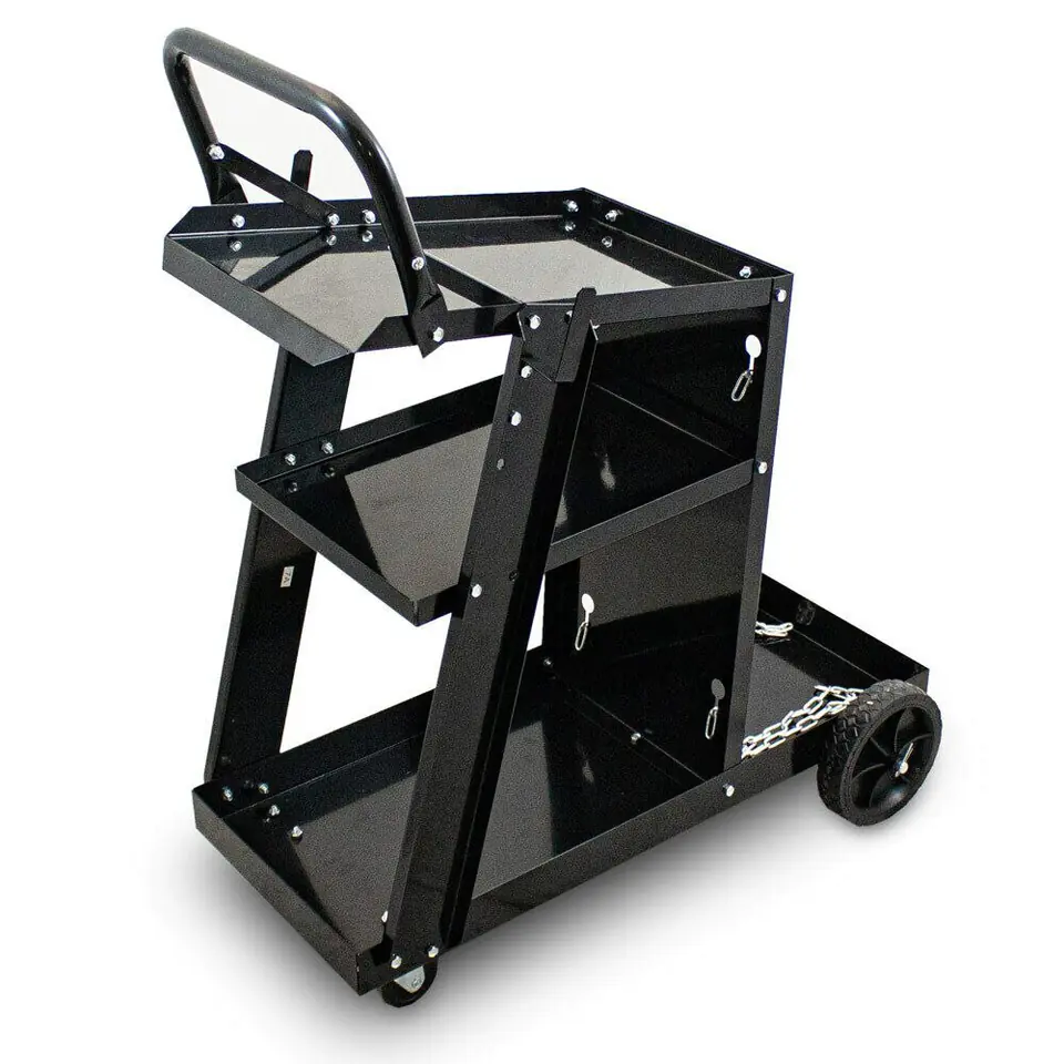 Features:-Can hold up to 40kg - 3 shelves for tools or MAG / TIG welding machines - Storage space for gas cylinders, including chain lock - 2 hose hooks - Two large 8 inch wheels - Two 3 inch swivel wheels