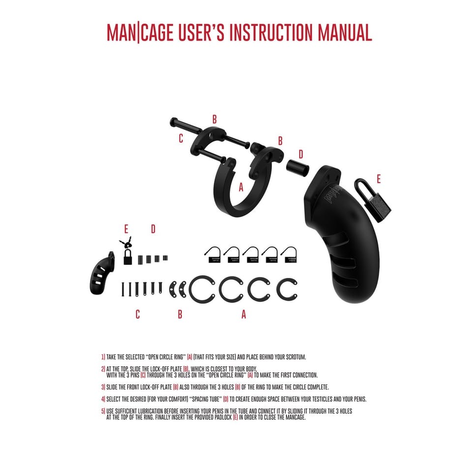 Feel the ultimate power as the key holder of your partners most intimate parts. Experience the most liberating feelings when opening the lock. All control is in the hands of your Dominant. This Mancage is an absolute must for people who love kinky BDSM! With this Mancage you prevent an erection by ‘cageing’ your penis - which builds up to an extreme release when it is removed.This Mancage is made of medical grade silicone and is available in two sizes. There are several adjustable rings added that secure your penis and balls with a strip. This Mancage offers the extra pleasure of a splitting ballstrap, which is placed tightly between the balls and is connected to the ring and the cage. Which is also made of a comfortable silicone. Due to the medical grade silicone it is safe to wear all day long, and it fits smoothly under clothing. This way you can wear it secretly, but with ease, everywhere. It has functional openings for ventilation and toileting and is easy to clean. This Mancage comes with several plastic clasps, to be used if extra discretion is required (like security checks). These locks can be cut loose when the time comes for the ultimate release. A sturdy metal lock is also included. Looking for something really exciting and naughty? Do you want to be thoroughly controlled by your partner? This Mancage gives the opportunity to take all power or to completely hand it over to your partner. Kinky? That is a sure thing. Play safe, go for comfort and only allow discomfort or pain when asked and no one is harmed in the long run. Take off the cage while sleeping.