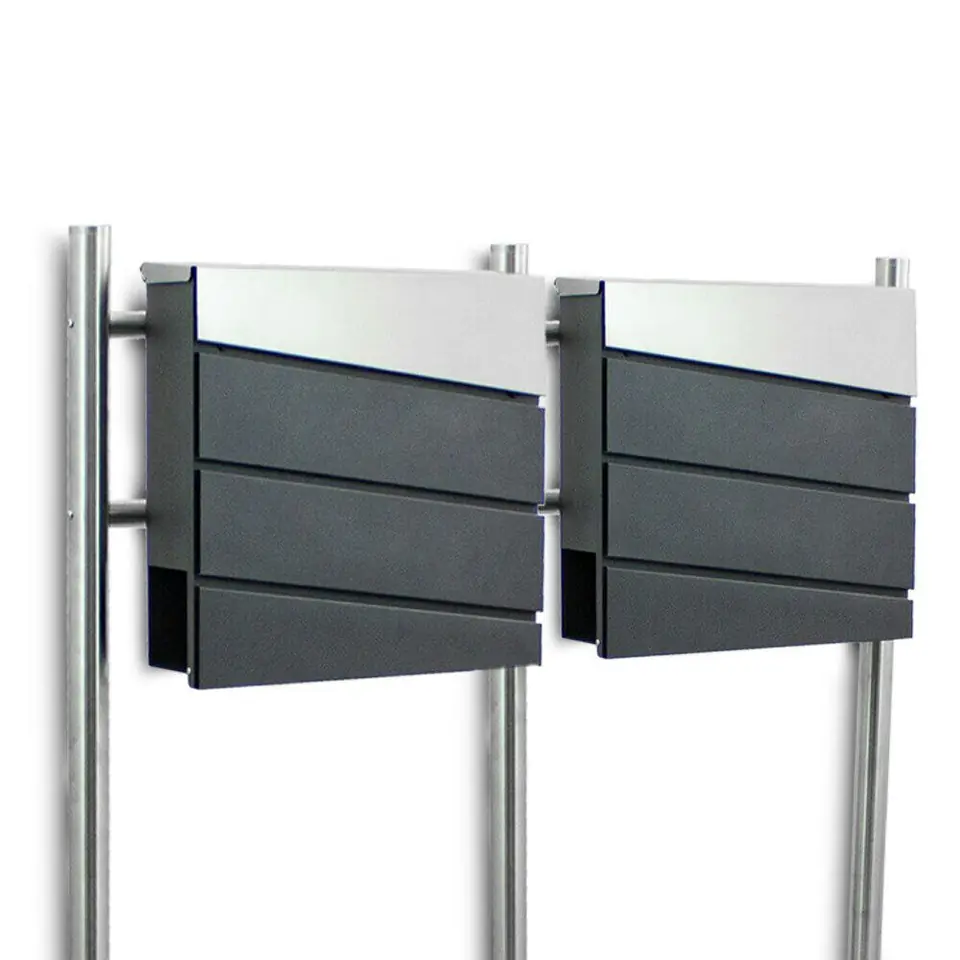 Podwójna i nowoczesna skrzynka na listy na stojaku jest odporna na opady atmosferyczne. Skrzynka pocztowa jest wykonana ze stali nierdzewnej, a grubość ścianek to około 0,8mm. Skrzynki posiadają otwory z tyłu, które pozwolą na łatwy montaż do słupków. Designerski wygląd zagwarantuje dbałość oraz styl na Twojej posesji.