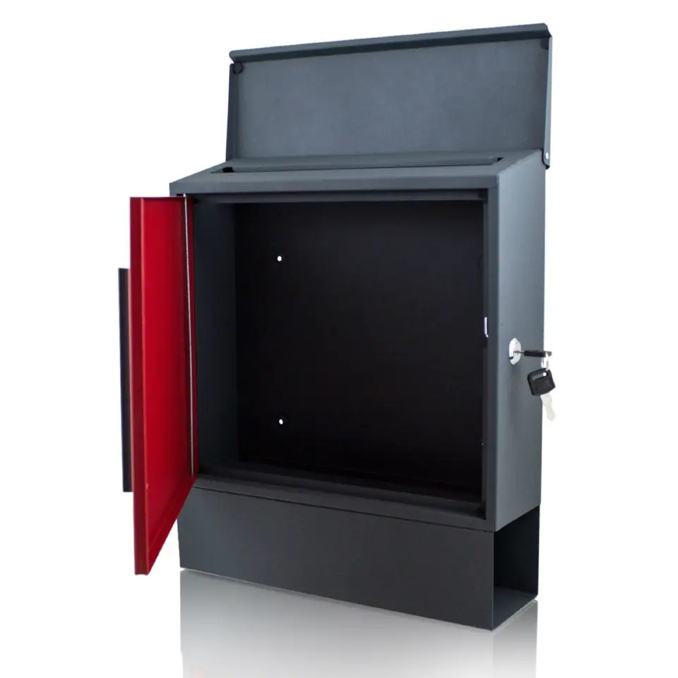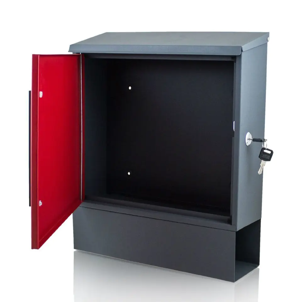 Dark grey colour with red letterbox front, newspaper below the front chamber, powder coated.