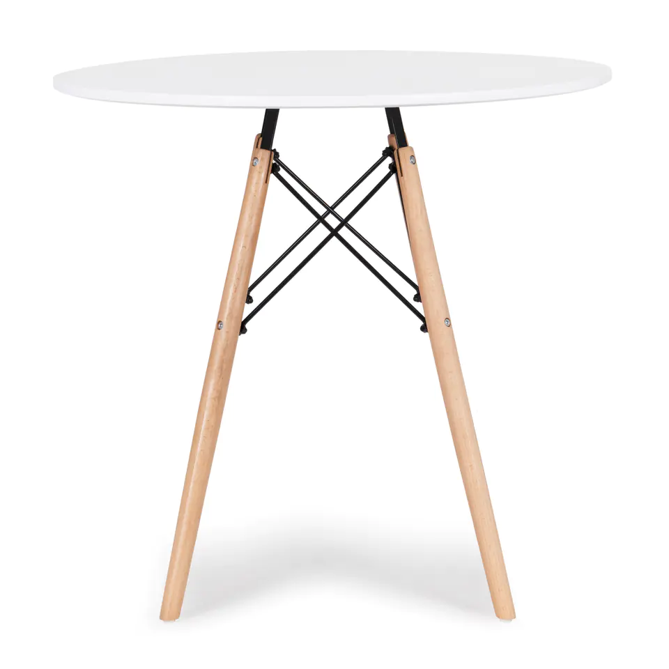 The legs of the table are made of durable beech wood and are connected by a metal, cross frame that gives rigidity to the entire structure. The top is made of MDF covered with a resistant veneer in matte white, its edges are specially profiled and devoid of sharp edges.