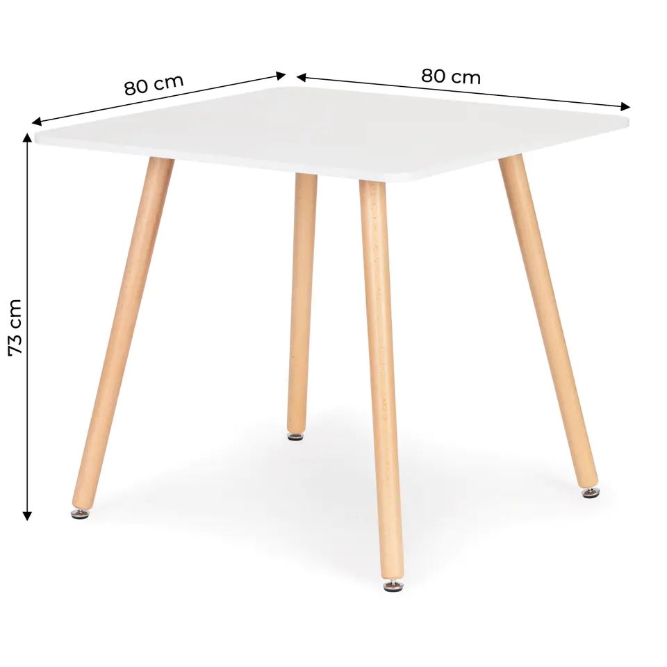 The legs of the table are made of durable beech wood, at their ends there are special, movable feet that will help level the table and avoid scratching the floor. The top is made of MDF covered with a resistant veneer in matte white, under it there is a metal frame in which the table legs are embedded.